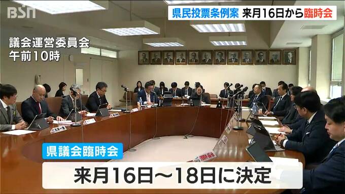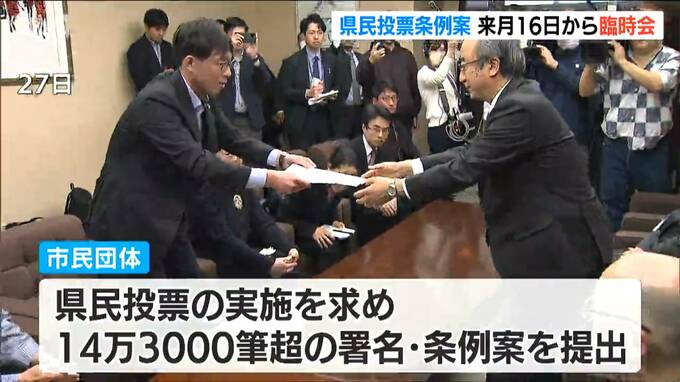 これを受け、県議会は31日、条例案を審議する臨時会について4月16日からの3日間の日程で開くことを決めました。初日の本会議の後に開かれる特別委員会には条例制定を求める代表者が出席し、意見を述べる機会が設けられるほか、地方自治の専門家1人を参考人として招く予定です。