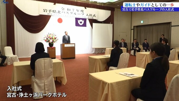 宮古市の浄土ヶ浜パークホテルで31日行われた入社式には、バス運転士を目指す2人や観光バスガイドとなる2人などあわせて7人が緊張した面持ちで出席しました。
