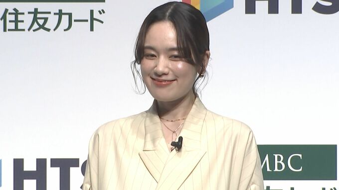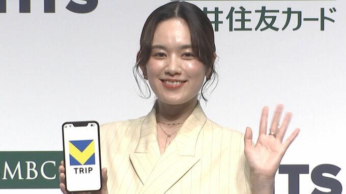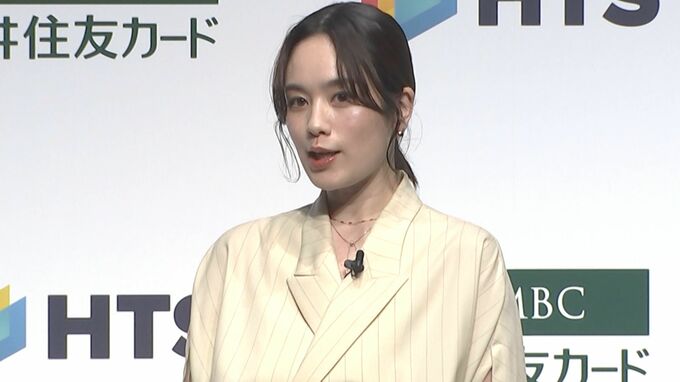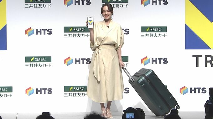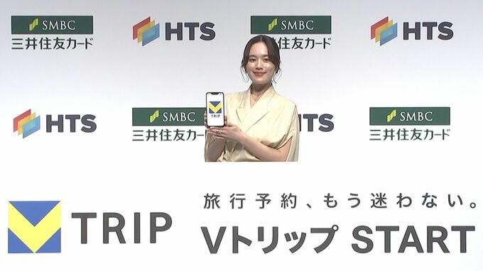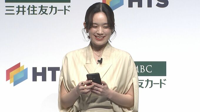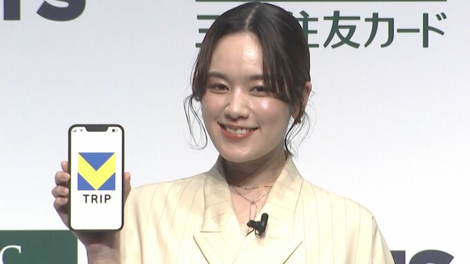 俳優の筧美和子さんが「三井住友カード×HTS 新旅行予約サービス「Vトリップ」発表会」にベージュのワンピース姿で登壇しました。