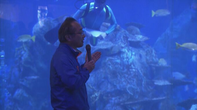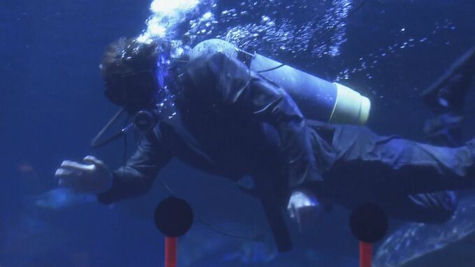 門出の舞台は「水槽の中」 3000匹の魚たちとともに恒例の「水中入社式」 新入社員らがメッセージを掲げる 三重・鳥羽水族館
