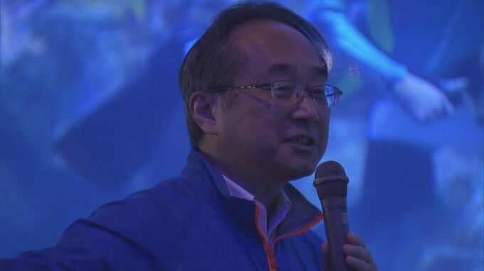 門出の舞台は「水槽の中」 3000匹の魚たちとともに恒例の「水中入社式」 新入社員らがメッセージを掲げる 三重・鳥羽水族館