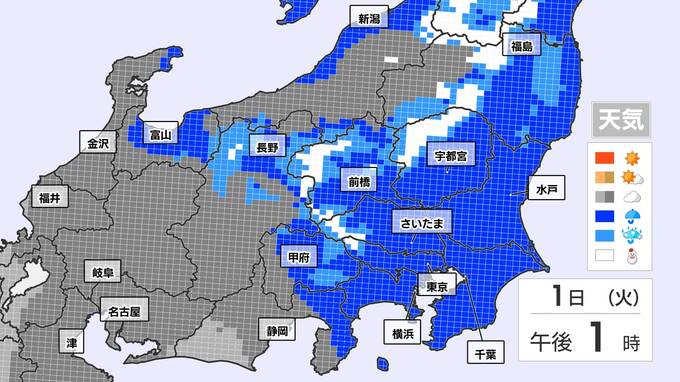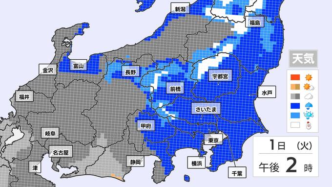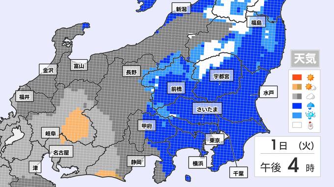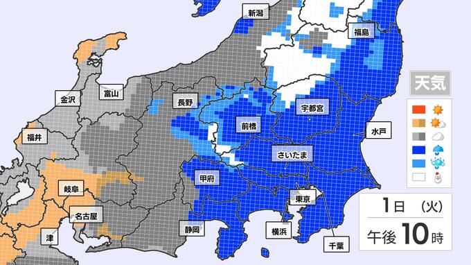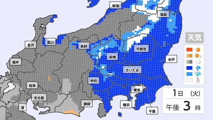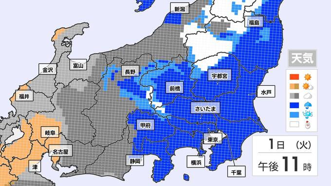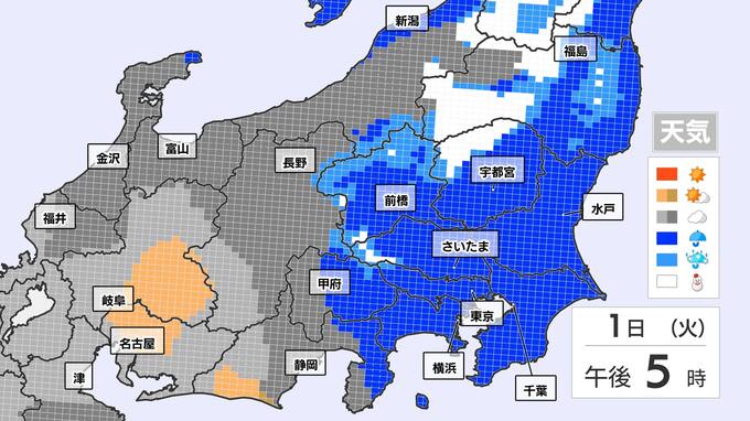 「オレンジ」は「晴れ」、「グレー」は「くもり」、「青」は「雨」、「水色」は「みぞれ」、「白」は「雪」の予想