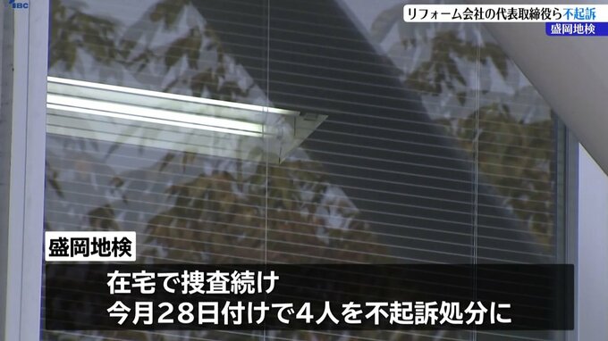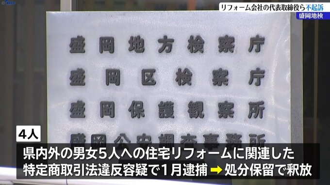 1月に特定商取引法違反の疑いで逮捕された東京のリフォーム会社の代表取締役ら4人について、盛岡地検は28日付で不起訴処分としました。