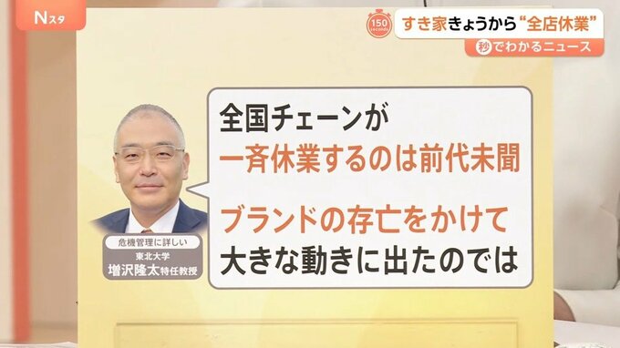 危機管理に詳しい東北大学の増沢隆太特任教授は「全国チェーンが一斉休業するのは前代未聞。ブランドの存亡をかけて大きな動きに出たのでは」と指摘しています。