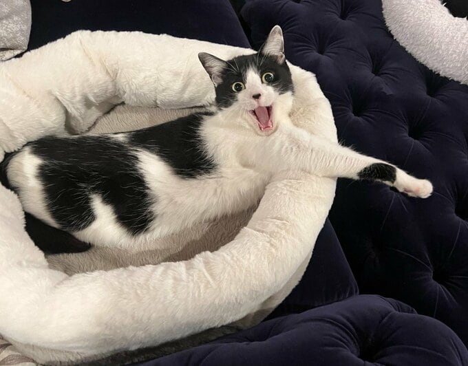藤さんが投稿した写真では、ふわふわに起毛した縁が丸くクッション面を囲んでいる猫ベッドに、ハチワレ模様の藤さんの愛猫・オレオが寝そべって伸びをしています。オレオは目をまん丸に口も大きく開けて、まるで何か楽しいものを見つけて驚きの笑顔を見せているような表情です。