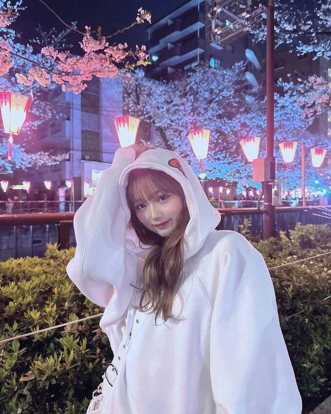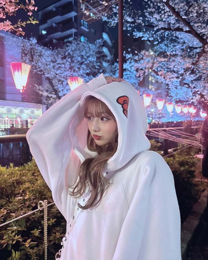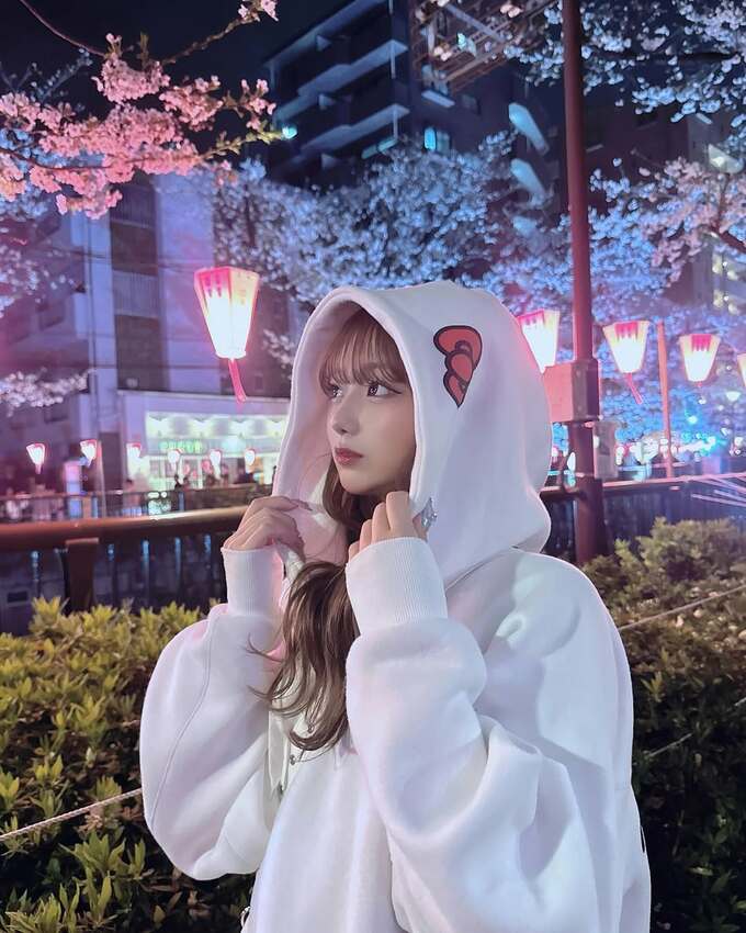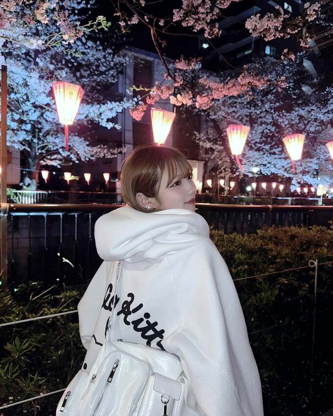 希空さんは「夜桜綺麗だった」と一言だけテキスト。桜の名所として名高い目黒川沿いの桜並木と思われる場所をバックに、ポーズを取っています。