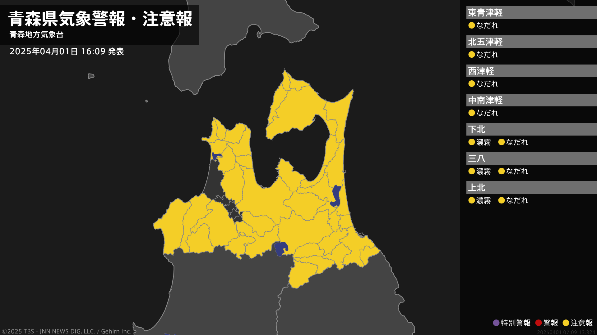 気象台は、午後4時9分に、なだれ注意報を青森市、弘前市、黒石市、五所川原市、十和田市、むつ市、平川市、平内町、今別町、蓬田村、外ヶ浜町、鰺ヶ沢町、深浦町、西目屋村、大鰐町、中泊町、野辺地町、七戸町、東北町、大間町、風間浦村、佐井村、三戸町、五戸町、田子町、南部町、新郷村に発表しました。