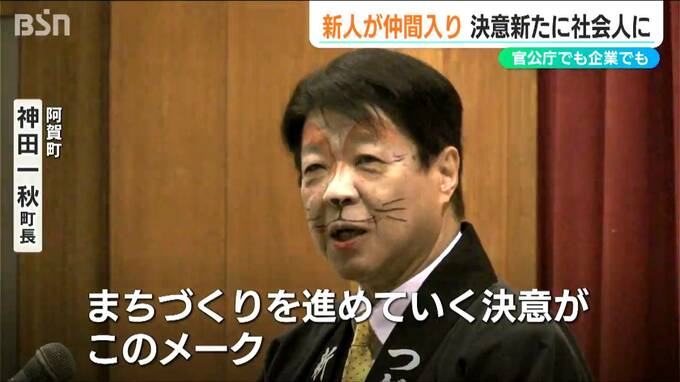 6月に行われる幻想的な行事『つがわ狐の嫁入り行列』で知られる新潟県阿賀町の役場では、神田一秋町長がキツネメークで辞令を交付しました。