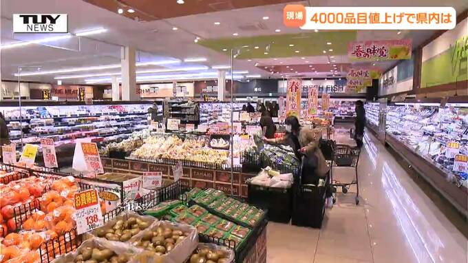 値上げの春です。今月は4000品目を超える食品が値上げされます。止まらぬ値上げラッシュに山形市のスーパーでは客も店側も頭を悩ませていました。大内希美アナウンサー「スーパーの入り口には4月からのお酒の…