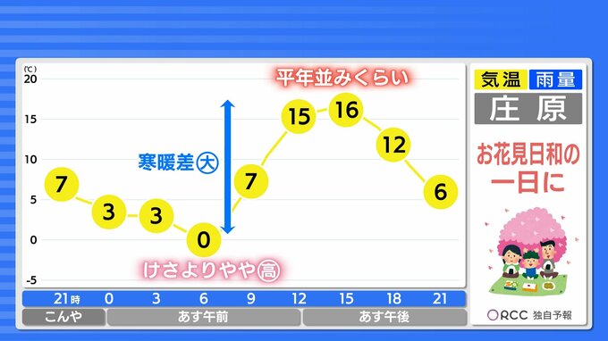 あす朝の気温は、けさより5℃前後高くなり、内陸部では10℃近く高いところもある見込みで、冷え込みは大幅に緩んできます。日中の気温は各地で平年並くらいで、この時期らしい暖かさになるでしょう。日中は上着いらずのぽかぽか陽気になりそうです。