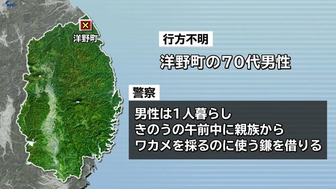 3月31日、洋野町の漁港にワカメ採りに出かけたとみられる70代の男性が戻らず行方不明になっています。警察は男性が水難事故に遭った可能性もあるとみています。行方不明になっているのは、洋野町に住む70代の男性…
