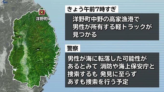 3月31日、洋野町の漁港にワカメ採りに出かけたとみられる70代の男性が戻らず行方不明になっています。警察は男性が水難事故に遭った可能性もあるとみています。