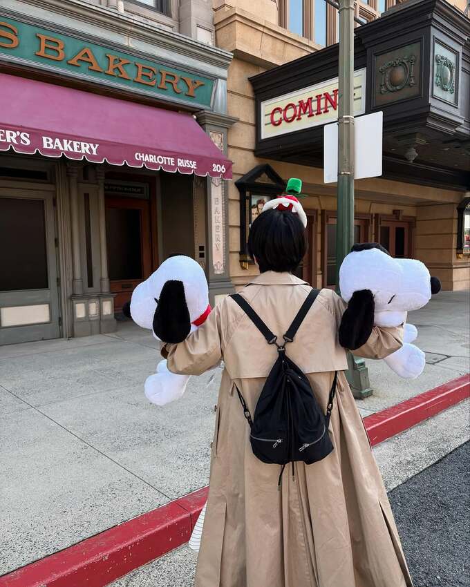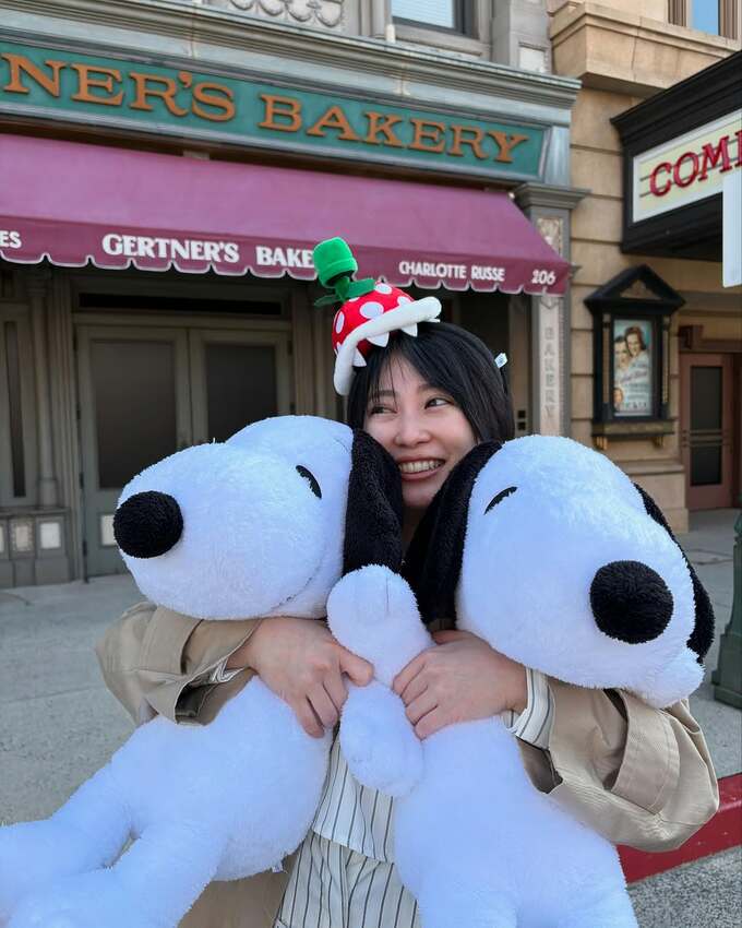 志田さんは、スーパーマリオ・ブラザーズのパックンフラワーの帽子をかぶり、両腕に大きなスヌーピーを1頭ずつ2頭抱きしめて満面の笑顔。背景のベーカリーの看板から、志田さんが大阪のUSJに訪れた時に撮られた写真だと思われます。