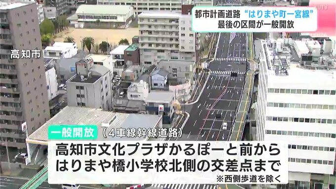 JR高知駅周辺の都市整備の一環で進められてきた工事は、新堀川で希少生物の生息が確認されたことなどから、一時中断。さまざまな調査や協議を経て環境への配慮をした形で、2018年に工事が再開されていました。この区間の完成に伴い、「はりまや町一宮線」はおよそ22年の歳月をかけて事業がおおむね完了しました。