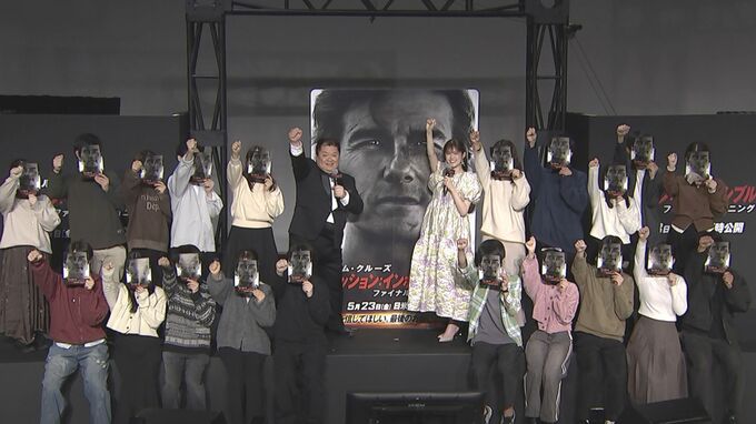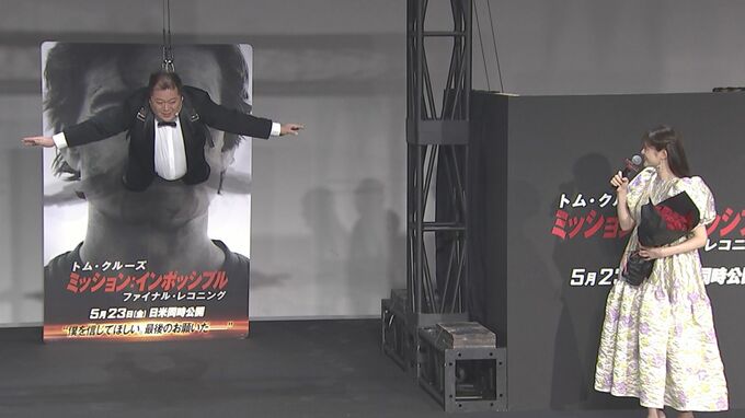 続けて、“今日、トム・クルーズさんがプロモーションのために来日されると聞いて、花束を持って来ました。でも、今の所いらっしゃらないですね...”とトムを探そうとすると、本作のメインテーマが流れだし、ステージにはトムと思わしき人物が。