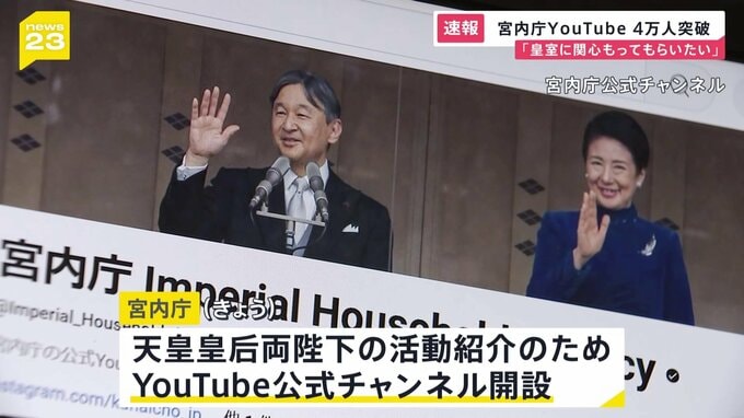 宮内庁は、天皇皇后両陛下の活動を紹介するため、1日、YouTubeで公式チャンネルを開設しました。午前10時から配信が始まり、チャンネル登録者数は4万人を突破しました。宮内庁は、若い世代を含めた多くの人に皇室…