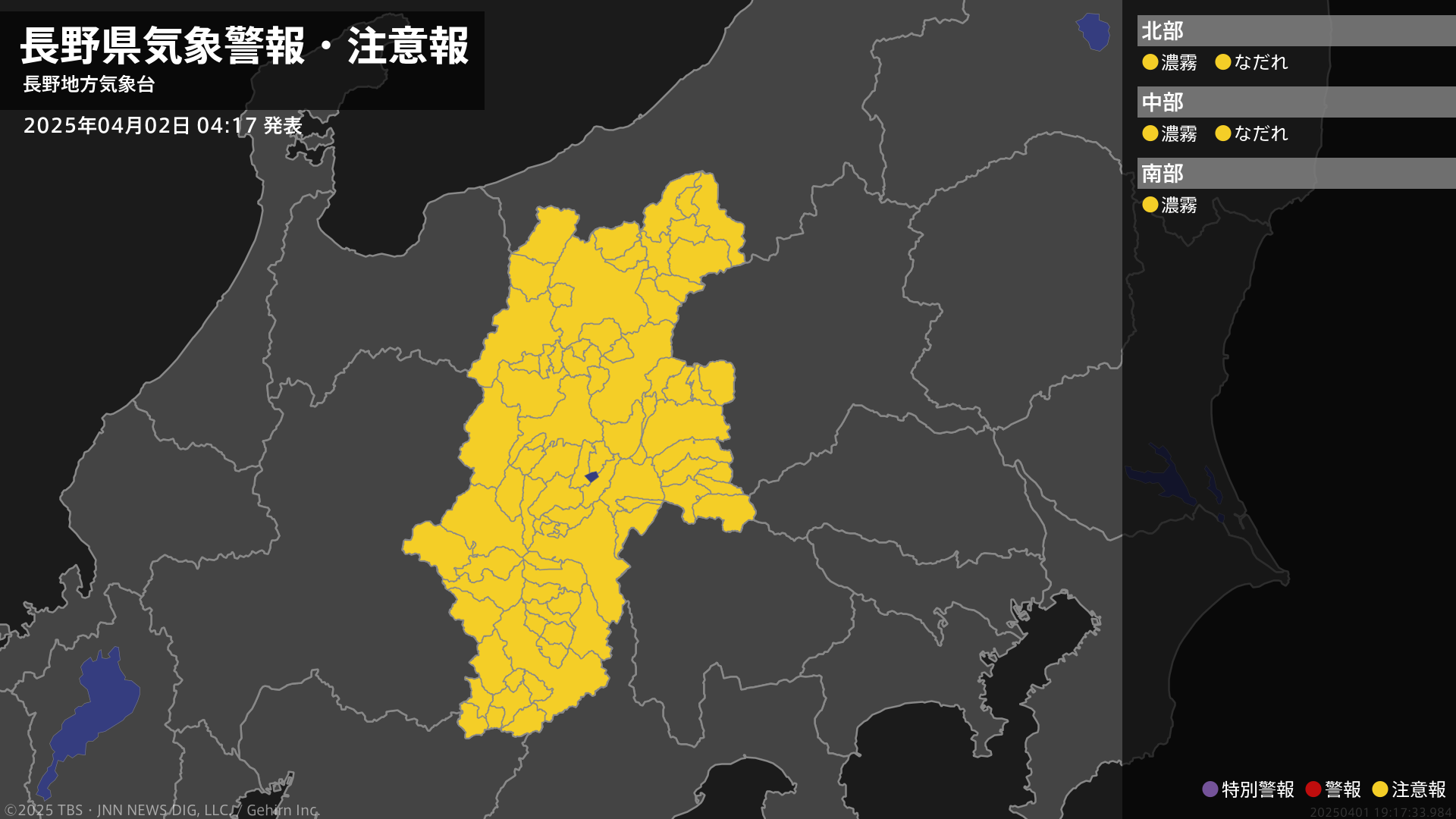 長野県では、2日昼前まで濃霧による視程障害に注意してください。北部、中部では、2日までなだれに注意してください。