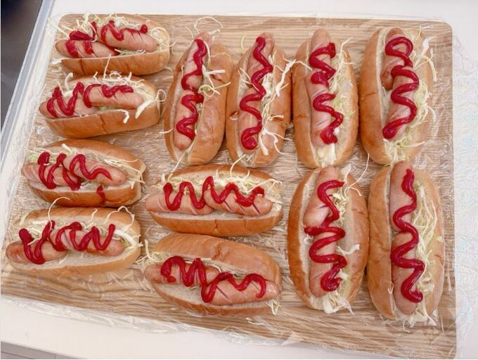 辻󠄀さんは、「そして朝はそらが花見に行くと言うので急遽簡単弁当を そして中学生には大量のホットドッグを…!! !! !! !! !! !! !!」と大量に作ったホットドッグの写真を公開。