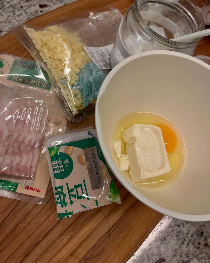 さらに「豆腐4分の1 米粉 カップ1 卵1 ベーキングパウダー 塩 少々 てんさい糖 適量 シュレッドチーズ ベーコン お好みで何でも入れられます。」とレシピも投稿。
