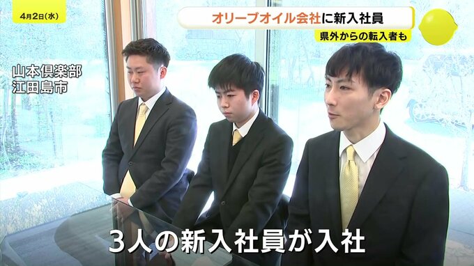 春の話題です。本場のコンテストで世界一位を獲得した「オリーブオイル」の製造・加工会社に、4月1日、新入社員が入社しました。人口流出が深刻な広島県にとってはうれしい、県外からの転入者の姿もありました。
