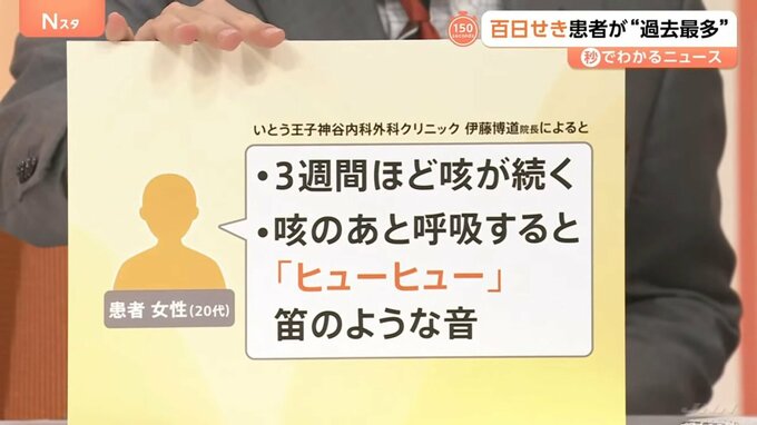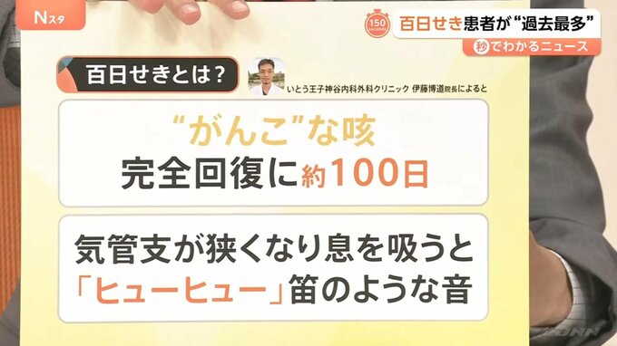 いとう王子神谷内科外科クリニックの伊藤博道院長によりますと「“がんこ”な咳が続き、完全回復までに約100日かかる」「気管支が狭くなり、息を吸うと『ヒューヒュー』と笛のような音がしてくる」といいます。