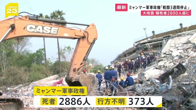 ミャンマー軍事政権は先月28日に発生した大地震を受け、抵抗勢力との戦闘を3週間停止すると発表しました。先月28日の地震で震源に近いマンダレーにあるマンションが倒壊した瞬間の映像。11階建てのマンションは4棟…