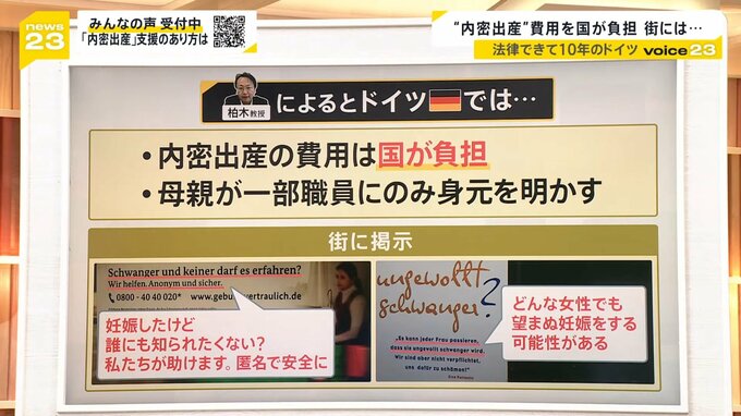 海外の事例を柏木教授に伺いました。ドイツは法整備が進んでいて、内密出産の費用は国が負担します。また母親が一部職員にのみ身元を明かすそうです。