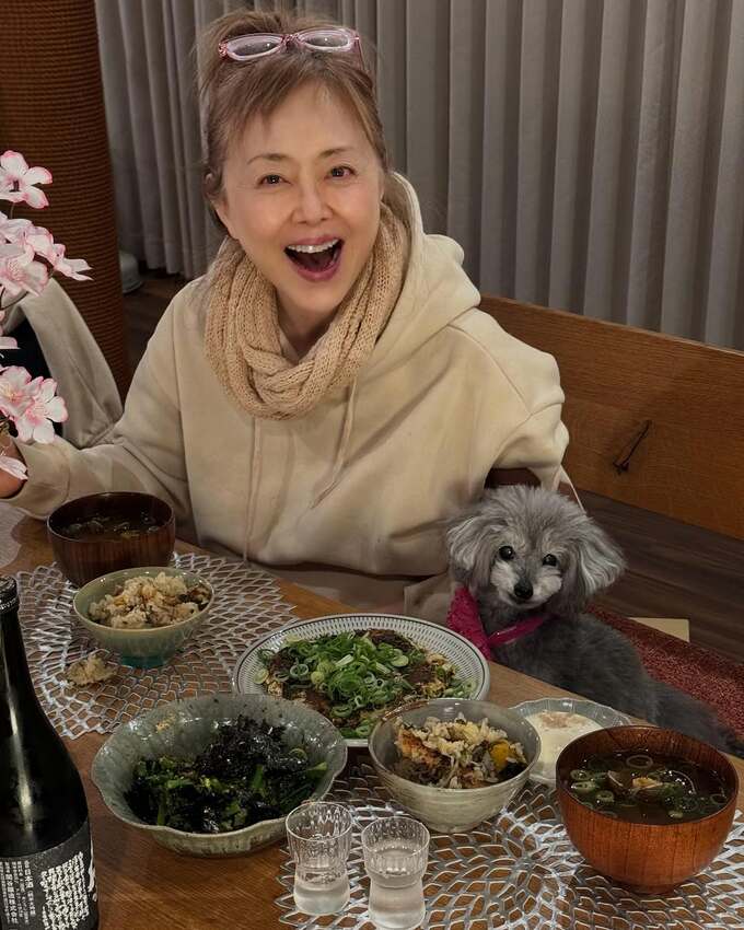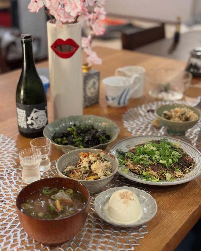 熊谷真実さんは「ご飯は 菜花の胡麻和え 切り干し大根と鰹節とキャベツ米粉のお好み焼き 貝のたきこみごはん アサリの味噌汁 マスカルポーネみたいなお豆腐」と綴ると、食事風景の写真をアップしています。