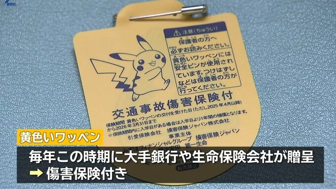 「黄色いワッペン」の贈呈は毎年この時期に大手銀行や生命保険会社が行っているもので、交通安全の願いを込めたワッペンには事故に遭った際に保険金が支払われる傷害保険が付いています。