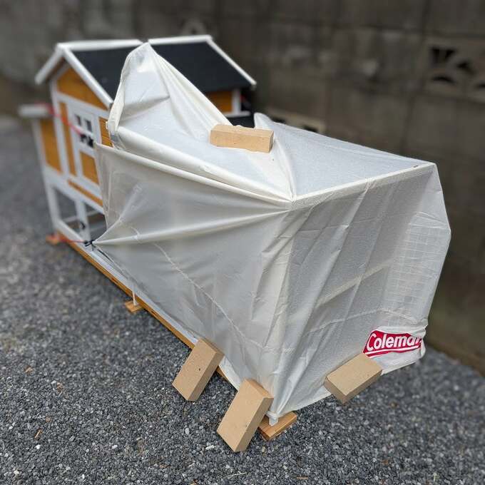 照英さんは「愛鶏(うるる&ひより&ちよのさん)の小屋」とテキストして写真を投稿。その写真では、ペットハウスキットと思われる小型の小屋のようなものに隣り合った格好で、鶏用のケージが配置されていて、そこに白のアウトドアタープがかぶせられ、角端からのロープがハウス側に止められつつ、タープにはレンガも置かれていて、万全に風対策がなされているように見えます。