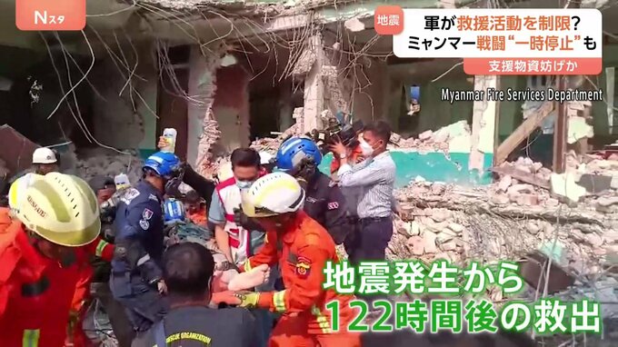 ミャンマーで起きた大地震を受け、国内で続いていた内戦は一時的に戦闘停止となりました。ただ、軍事政権が自らの支配地域以外に救援活動が及ばないようにしているとの指摘が出ています。地震の発生から7日目を迎…