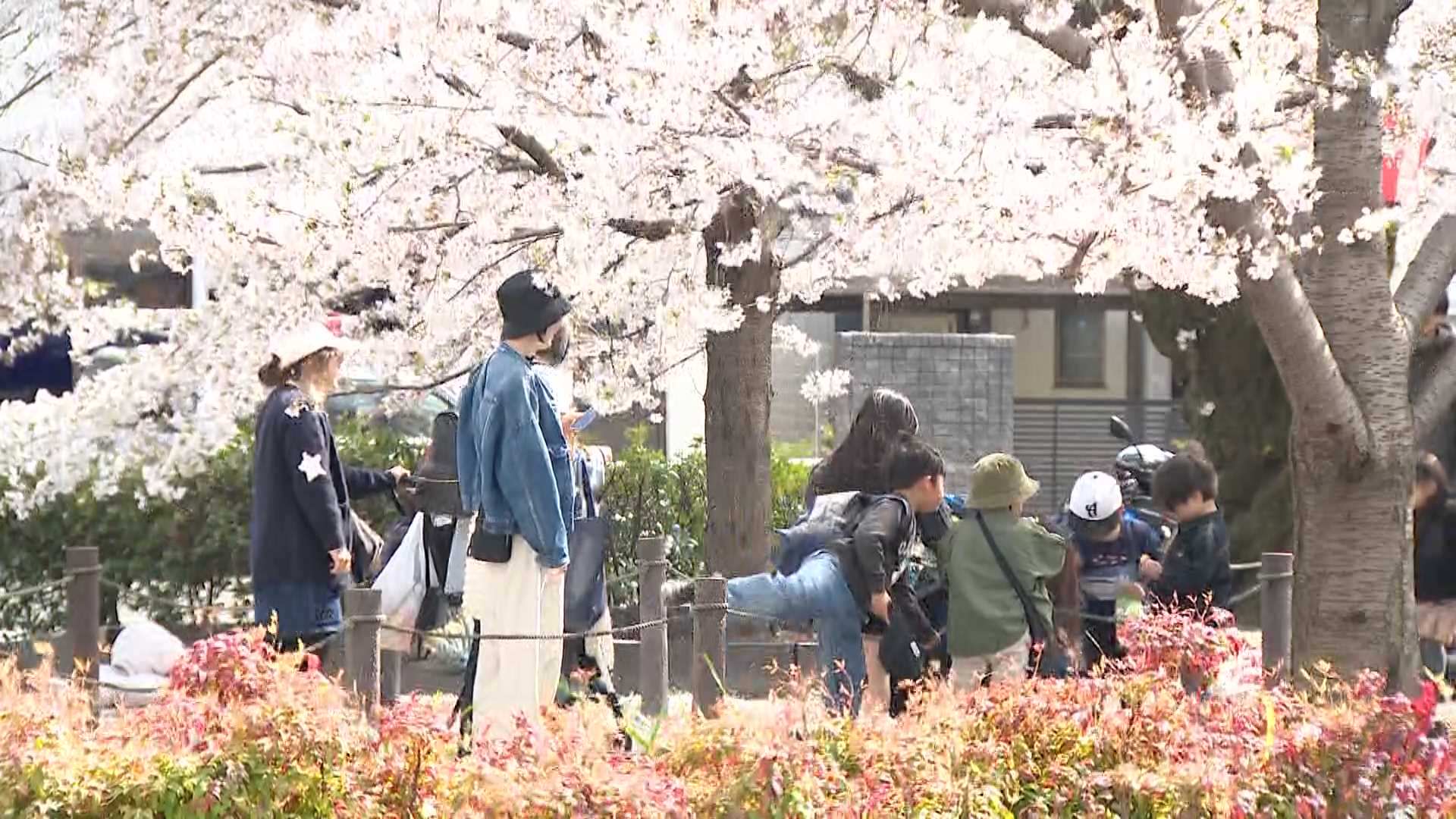満開の桜の下でたくさんの人たちの笑顔があふれています。