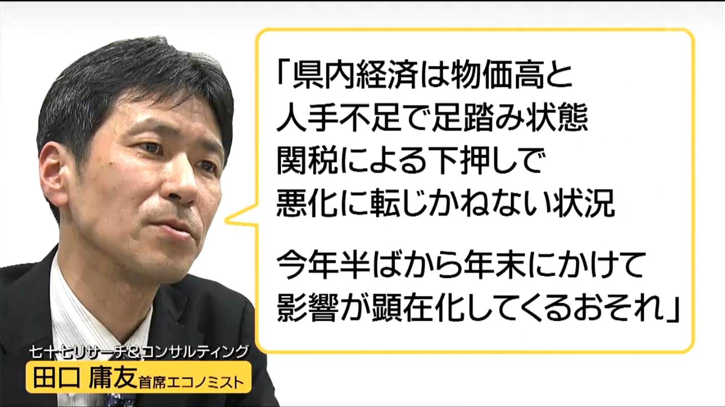 今回の関税措置について七十七リサーチ&コンサルティング田口庸友首席エコノミストは、「県内経済は物価高と人手不足で足踏み状態。さらに関税による下押しが加わると悪化に転じかねない状況」だとして、「今年半ばから年末にかけて影響が顕在化してくるおそれがある」と指摘しています。