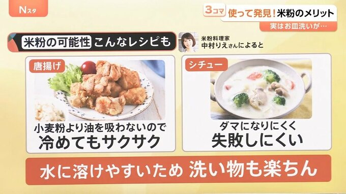 それから、家事にもメリットがあります。小麦粉が入ったシチューやカレーは、鍋にへばりついて、洗うのも大変ですよね。しかし、米粉を使うと水に溶けやすいため、洗い物も楽ちんになるということです。