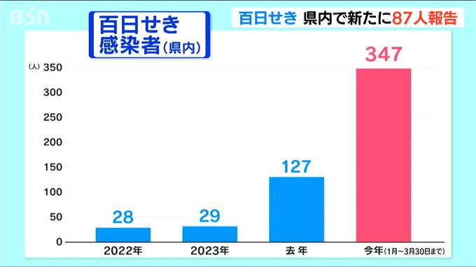 激しい咳が続く百日せきについて新潟県内で新たに87人の患者の報告が寄せられました。今年はこれで347人で、すでに去年1年間の数を大幅に上回っています。