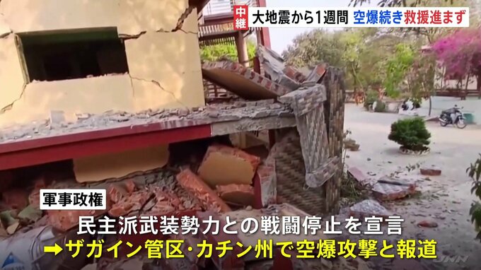 ミャンマー中部を震源とする大地震の発生からきょうで1週間。被災者支援のため、内戦は一時的にストップしたかに思われましたが、軍事政権はいまだに空爆を続けている模様です。中継です。内戦で国が荒廃するミャ…