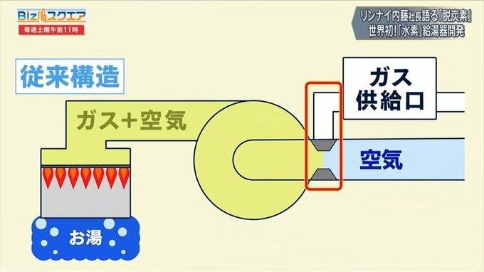 さらに、燃料を供給するパイプの位置も調整。従来のガス給湯器では、バーナーから離れたところにあったが、水素給湯器ではよりバーナーの近くに設置し、万が一逆火した場合も引火する水素の量を少なく抑えるのだ。