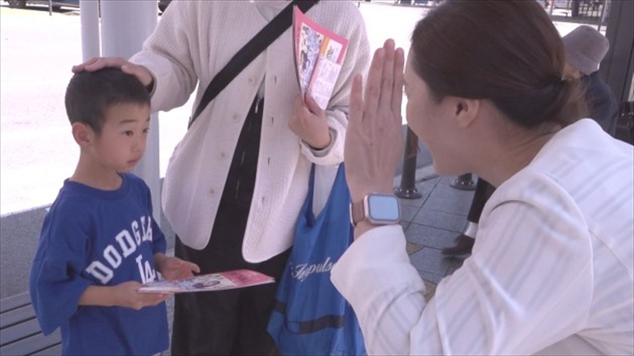 また、UTYの西垣友香キャスターも街頭に立ち、この春 新1年生になる子どもに横断歩道では手を挙げて歩くことなどを伝えました。
