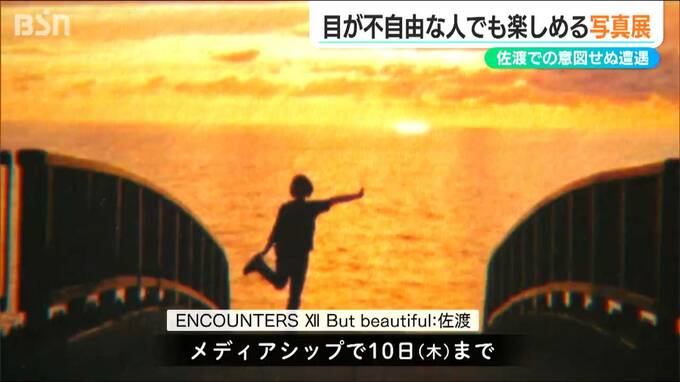 佐渡の風景を写した写真展が新潟市で始まりました。目が不自由な人でも写真が楽しめるよう、臨場感のある音声付きです。夏の日が沈む時の雲に見とれた北狄(きたえびす)の海岸、冬の北田野浦(きたたのうら)では種が…