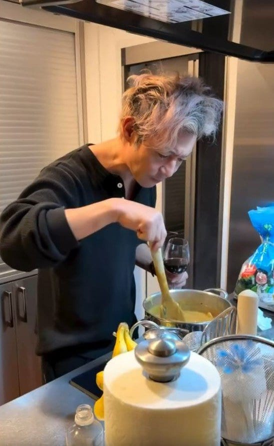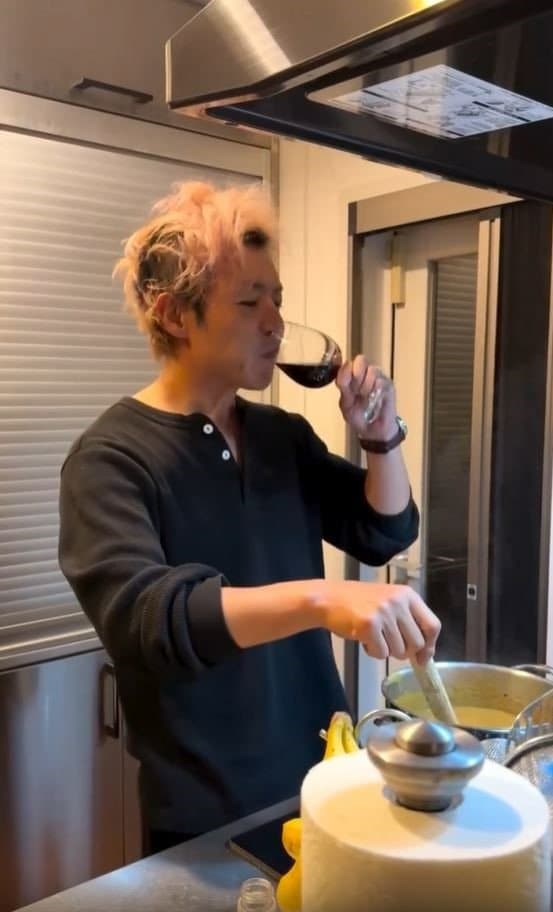 つるのさんは、「昨夜、先日帰国したばかりの息子がカレー食べたいっつーことらしいんで、張り切って作ったんですが、」とワイングラスを片手にノリノリでカレーを作る動画を投稿。