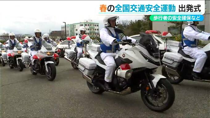 【子どもたち】「ドライバーのみなさん、横断歩道は止まりましょう!」6日から『春の全国交通安全運動』が始まるのを前に、新潟県庁で出発式が行われました。今回は歩行者の安全確保などを呼びかけていきます。出…