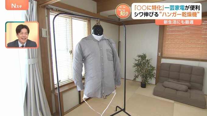 洗濯したシャツなどをエアバッグの上から被せ、シワにならないように微調整。スイッチを押すと、暖かい風が充満してシワを伸ばしながら乾かしてくれます。ワイシャツだと30分が目安だそうです。