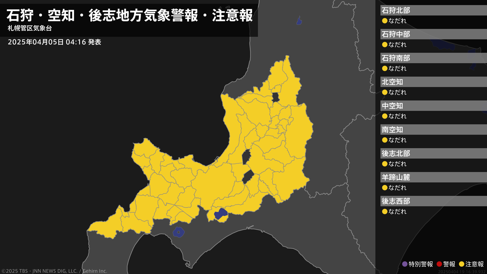 気象台は、午前4時16分に、なだれ注意報を札幌市、小樽市、夕張市、岩見沢市、美唄市、芦別市、江別市、赤平市、三笠市、千歳市、滝川市、砂川市、歌志内市、深川市、恵庭市、北広島市、石狩市、当別町、島牧村、寿都町、黒松内町、蘭越町、ニセコ町、真狩村、留寿都村、喜茂別町、京極町、倶知安町、共和町、岩内町、泊村、神恵内村、積丹町、古平町、仁木町、余市町、赤井川村、奈井江町、上砂川町、由仁町、長沼町、栗山町、月形町、浦臼町、新十津川町、秩父別町、雨竜町、北竜町、沼田町に発表しました。