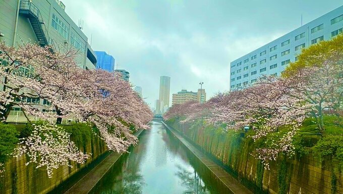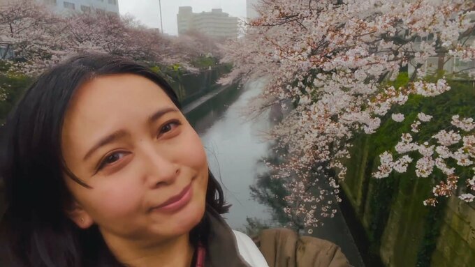 この日の天気はあいにくのようでしたが、「お天気は悪くてもフィルター入れるだけで綺麗な桜に」と、ちょっとボケの入った加工で幻想的な雰囲気になっています。そして「目黒川の桜もインバウンドしてました」と、数多くの外国人の方々で賑わっている様子を伝えています。