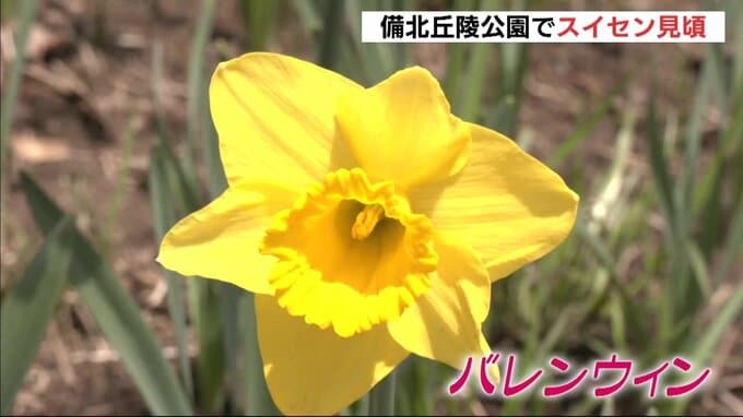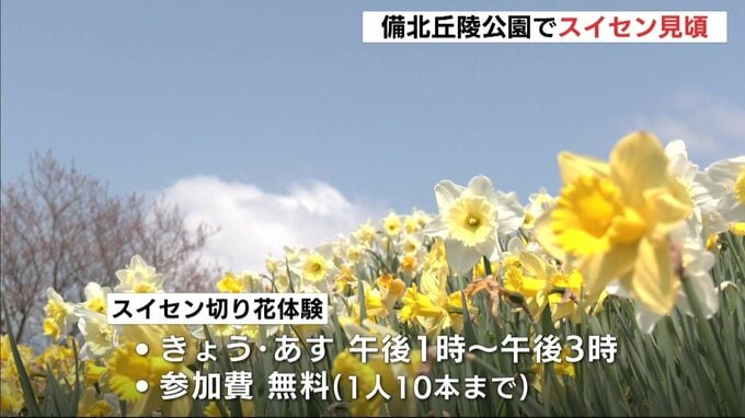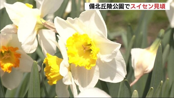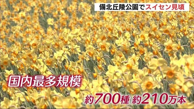 庄原市の国営備北丘陵公園で、国内最多規模のスイセンの花畑が見頃を迎えています。