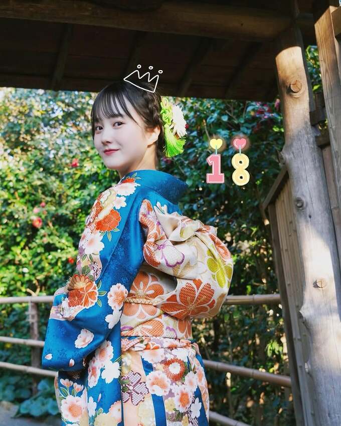 紗来さんは大輪の桜と椿が縫い込まれた瑠璃色の振り袖に、結い髪の花房飾りを合わせ、帯を見せつつ微笑みながらこちらを振り返る「見返り美人」ポーズの写真を投稿。「本日4月4日、18歳になりました!」と元気よく報告しています。
