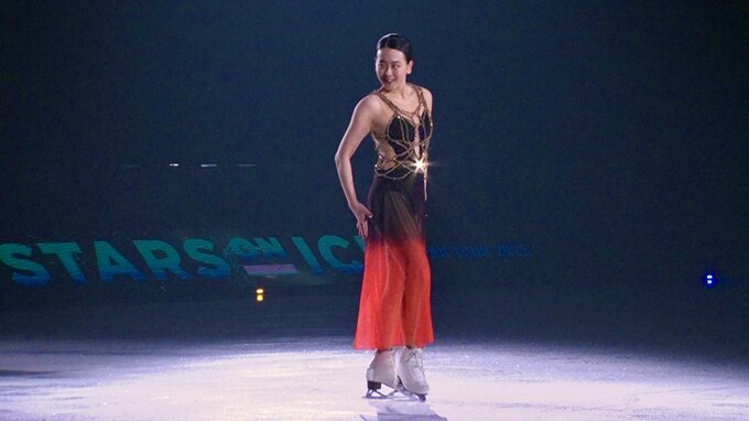 今年のスターズ・オン・アイスのテーマは”ROCK”。まさにそれを体現した演技で会場を沸かせたのは、坂本花織をはじめとする8人の現役日本人スケーターたち。グループナンバーでB’zの『ultra soul』を披露した。ギターの音色に合わせて8人が次々とジャンプを決めると会場は拍手喝采。アイスショーならではのナンバーで観客を魅了した。そしてここで会場が暗転し、TBS南波雅俊アナウンサーが登場。再び『ultra soul』のイントロが流れ始め、南波アナの大熱唱と選手たちのパワフルな滑りという“一夜限りのコラボ”が実現した。