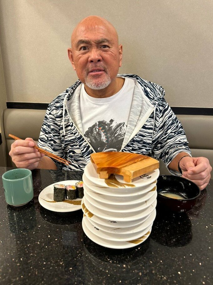 続く投稿では「病院から直行して、某寿司チェーン店で外食!!」と、寿司店でのワンショット写真を掲載。目の前に食後のお皿がうず高く積まれているのですが、武藤さんは「気合いを入れて食おうと思ったのに、、、ヤバい!!」「胃が小ちゃくなってる」と、リングの上で宿敵に遭ったときのような表情でこちらを見つめ「あんまり食えね〜〜」と嘆いています。