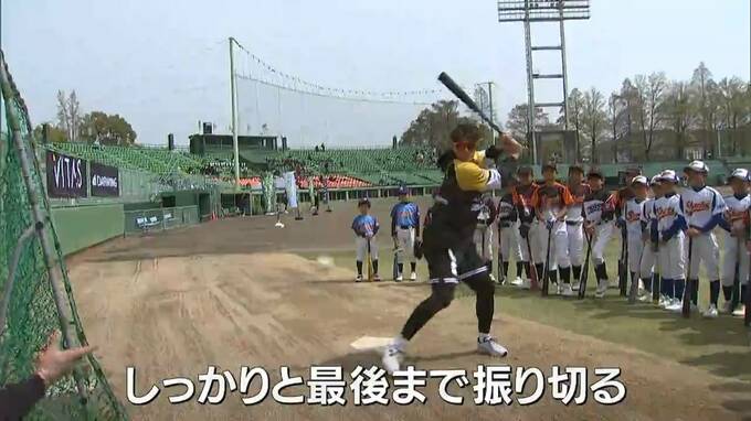 糸井さんは打席に立つ際の心得やスイングのコツなどを伝授し、小学生は熱心に練習に励んでいました。