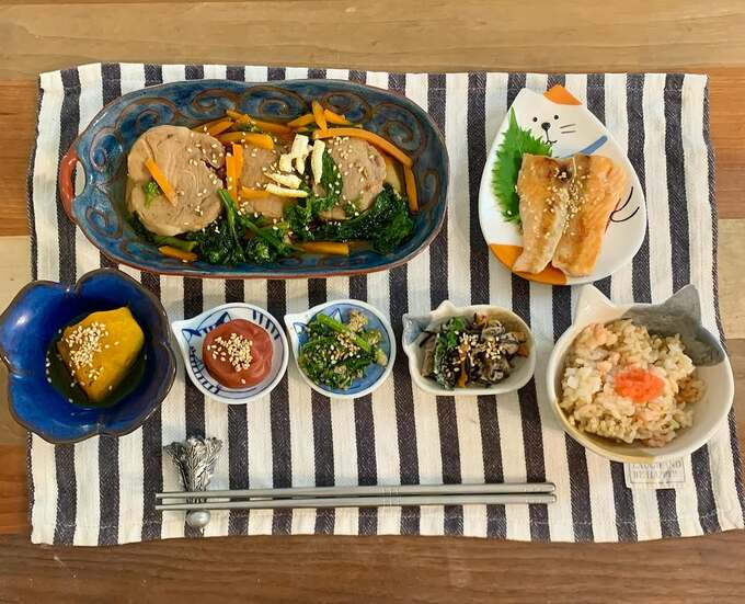 さらに「お肉もお魚もお米もお野菜も、しっかり摂取しました!!」として、続く投稿で最近のメニューを紹介。「豚ヒレ焼豚・サーモンハラス焼き・玄米ご飯・豚バラと菜の花のヒジキ煮・菜の花の胡麻和え・梅干し・かぼちゃの煮付け」と、充実した内容を紹介しています。
